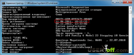 Эта команда показывает не только, дату установки Windows, но и много другой интересной информации.